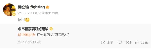 12月20日訊 韋世豪發(fā)聲質(zhì)疑后,楊立瑜轉(zhuǎn)發(fā)韋世豪微博質(zhì)疑足協(xié)準(zhǔn)入。