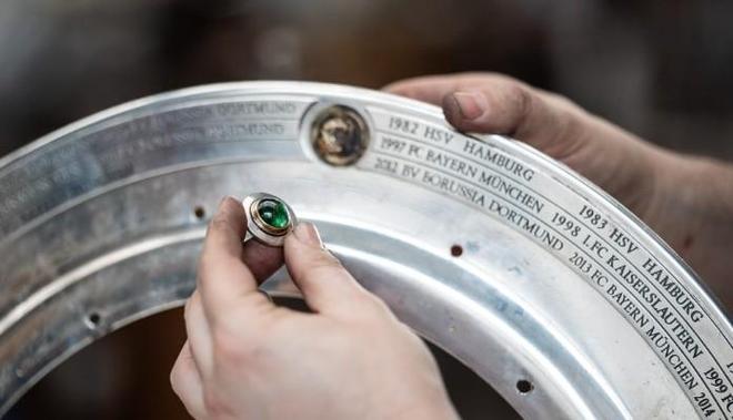 自1903年以來所有德甲冠軍的名字都鐫刻在獎杯上,每個賽季結(jié)束后,新冠軍的名字會被添加進去,1981年,沙拉盤首次擴容:加裝了一個銀環(huán),環(huán)上配有刻字板以及5顆總重71.98克拉、鑲嵌在黃金底座中的翠榴石弧面寶石